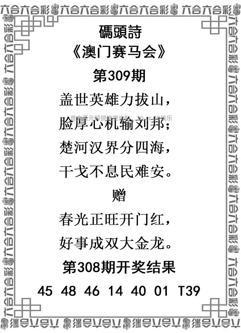 | 308期 | 马牛 | 06合 | 4头双 | 兔39 |