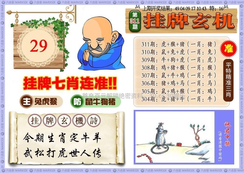 | 310期七肖 | 虎蛇鸡兔龙猪羊 | 开:虎16 |